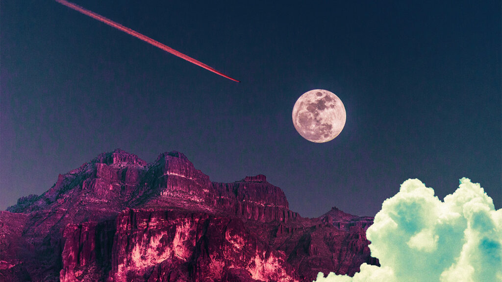 In a sentence, I define my art as “contemporary surrealism collage art” — and I think that fits pretty well. I love making art with the moon, mountains and stylized color palettes to convey a message. I’m fascinated by underwater life and have a slightly fearful respect for outer space, so my work incorporates those aspects. A lot of the other symbolism in my work represents aspects of how I’m feeling.